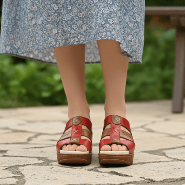Sandália Anabela Feminina de Couro Legítimo e Palmilha Gel - Vermelho /Castanho (NI022)
