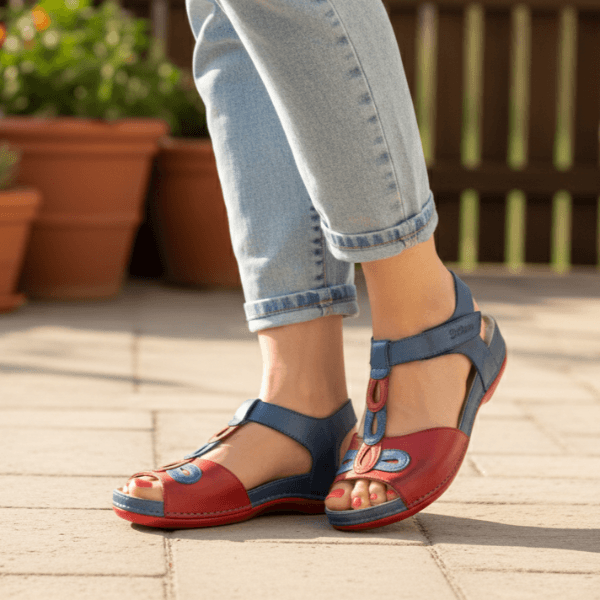 Sandália Bem-Estar Ortopédica em Couro Legítimo - Azul /Vermelho - Sola Vermelha (BE004)