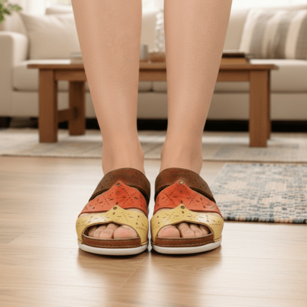 Sandália Bem-Estar Ortopédico em Couro Legítimo - Castanho /Coral /Amarelo - Sola Off (BE005)